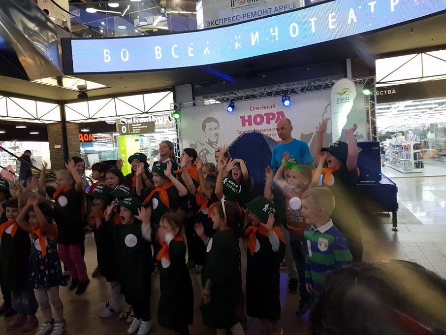 Наш опытный инструктор отправился с маленькими посетителями «Норы» в настоящий поход в условиях торгового центра. Дети прошли школу юного туриста: попробовали свои силы в установке палатки, вязали узлы и примеряли на себя настоящее скалолазное снаряжение. А ещё каждый участник стал обладателем диплома и приглашения в школу детского скалолазания O’Skal!