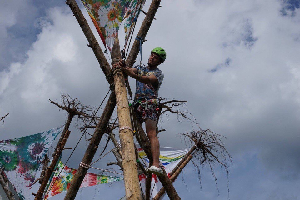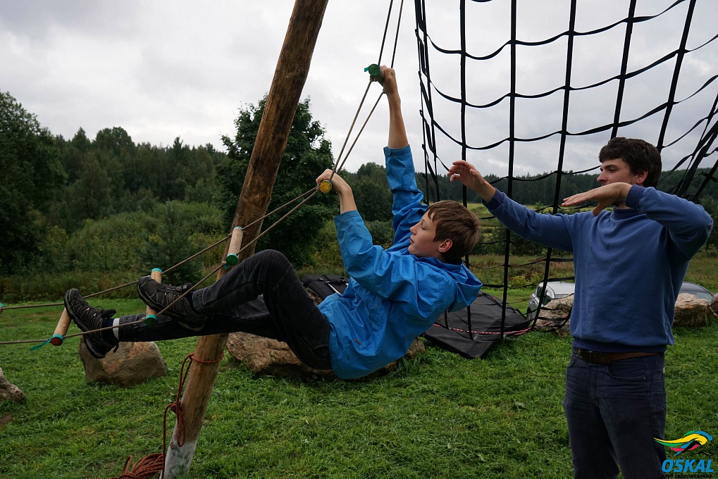 Еще мы часто строим для детей полосу препятствий, мини панда-парк. На Ворголе, например, мы построили трассу длиной около 20 метров. Чтобы ее пройти, нужно было где-то перелезть с дерева на дерево по бревну, где-то – пройти по стропе (так называемый слэклайн [вид спорта, который заключается в хождении по специальной стропе, натянутой между стационарными объектами – станциями], со страховкой, конечно) на определенной высоте – младшие проходят, держась руками за дополнительную стропу, а старшие – не используя руки. Где-то нужно было с помощью тарзанки перебраться с одного места на другое. Для выполнения подобных упражнений мы всегда выстраиваем ребят в таком порядке, чтобы те, у кого это хорошо получается, шли первыми, а потом помогали товарищам, которые идут следом. Самые младшие ребята перебираются в середине очереди, когда и сзади, и спереди их страхуют старшие. Так дети учатся работать в команде.