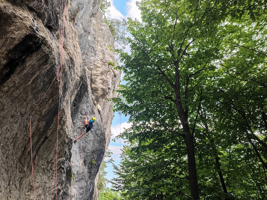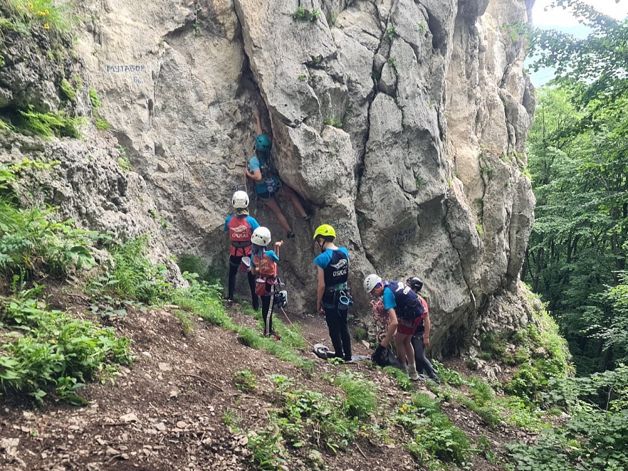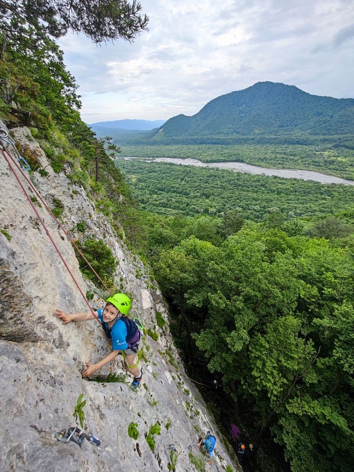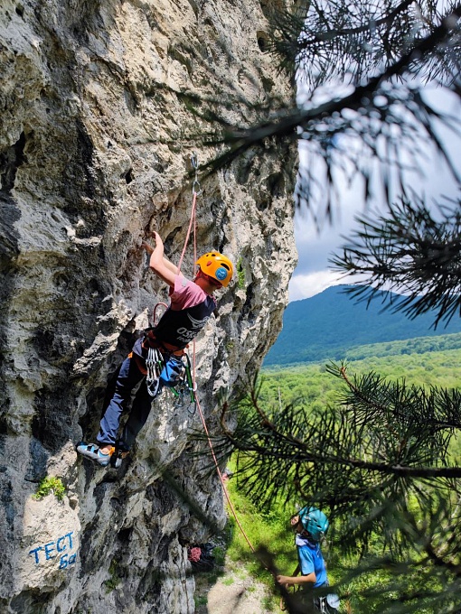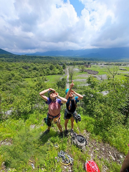 После долгой разлуки со скалами, чередой соревнований и тренировок на скалодроме всем хотелось как можно быстрее оказаться на месте. В первый же день, не мешкая, собрали рюкзаки, трансфер, 10 минут непростого подъёма – и мы прибыли. Одеваем каску и систему, раскладываем веревку, вешаем на себя оттяжки, проверяем страховщика и начинаем свой подъем по маршруту наверх. Если вы хоть раз лазали по скалам, то поймёте эти ощущения. Первый тренировочный цикл был направлен на объем простого лазания, адаптацию к нагрузкам и отработку навыков взаимодействия на скалах. Вспоминали, как организовать верхнюю страховку, перевязываться на станции и снять маршрут. Закончили этот цикл днем отдыха: прогулкой по набережной реки Терек в городском парке, подвижными играми на площадке и мини-соревнованиями по прыжкам в длину.