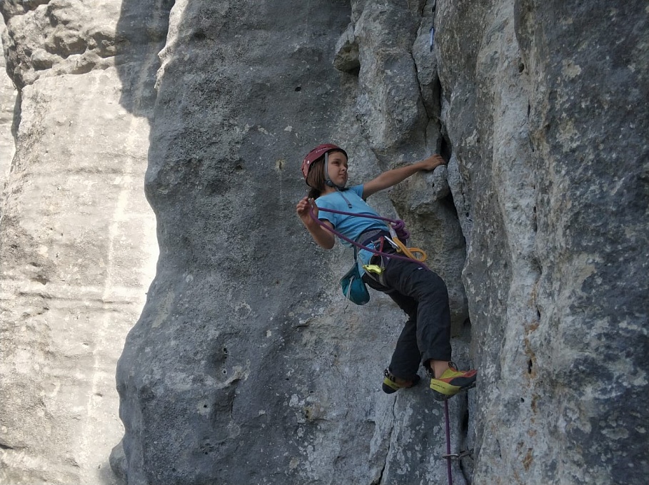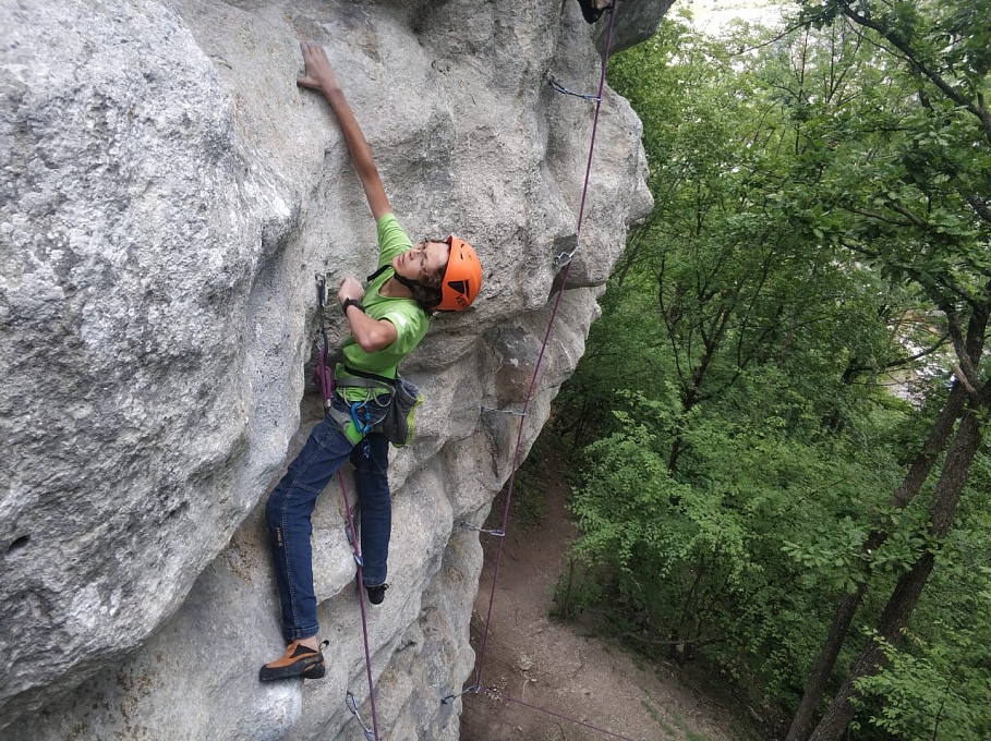 Ибрагимова Лиза и Зайцев Кирилл - 6б+(«Барбариска»), трасса не из лёгких, не всякий взрослый с ней справится. Кирилл, кстати, работал над сложной 6с («Гек») и, будь у него еще денёк, заборол бы и её.